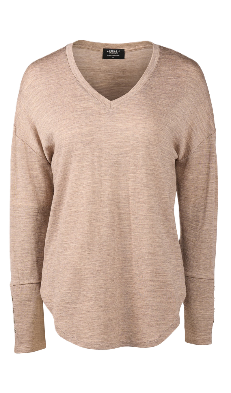 The 4465 COFFEE CREAM Easy Fit Button Cuff V Neck Top made in Silky Superfine Merino is an Easy Fit, that doesn't cling. The sides are normal length, with added front and back length which not only looks smart, it doesn't un-tuck when you raise your arms. Perfect for adding under an open jacket when you want a fine layer for added warmth, without the bulk of a knitted jumper. Enjoy the wonder of a Cozy Warm Layer that is silky to the touch, but not bulky.