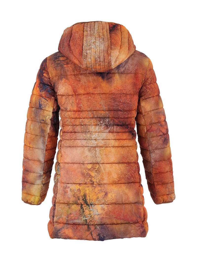 In addition to the beatuful artwork, it is a practical lite-weight quilted coat that keeps the wind out and lite rain showers off. Featuring a Covered Zip-up front & with a domed tab, regular-fit, stylish zip-off hood and stand up collar, zip-up pockets, and long sleeves with stretch elastic bound cuffs.