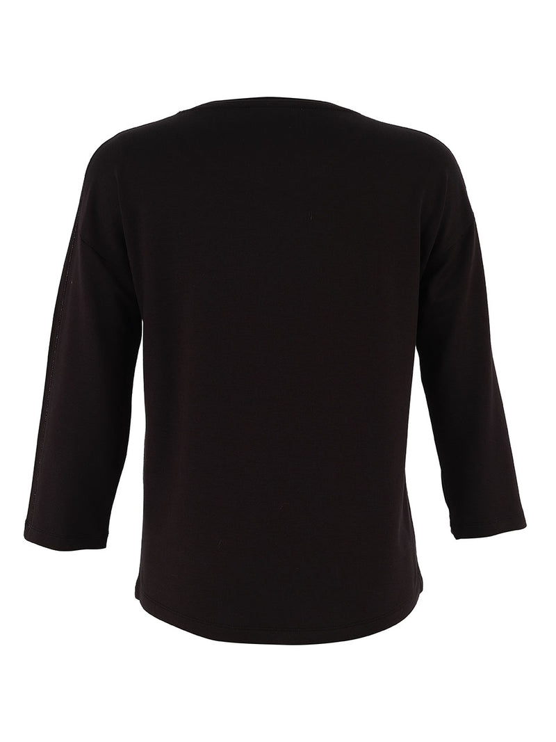 A three-quarter sleeve jersey top featuring Lana Frey’s “Baisti” portrait, the Dolcezza Nightlife Face Print Viscose Top combines abstract artistry with subtle embellishment. The stylised face motif is accented with multicoloured rhinestones for a soft shimmer against the black backdrop.
