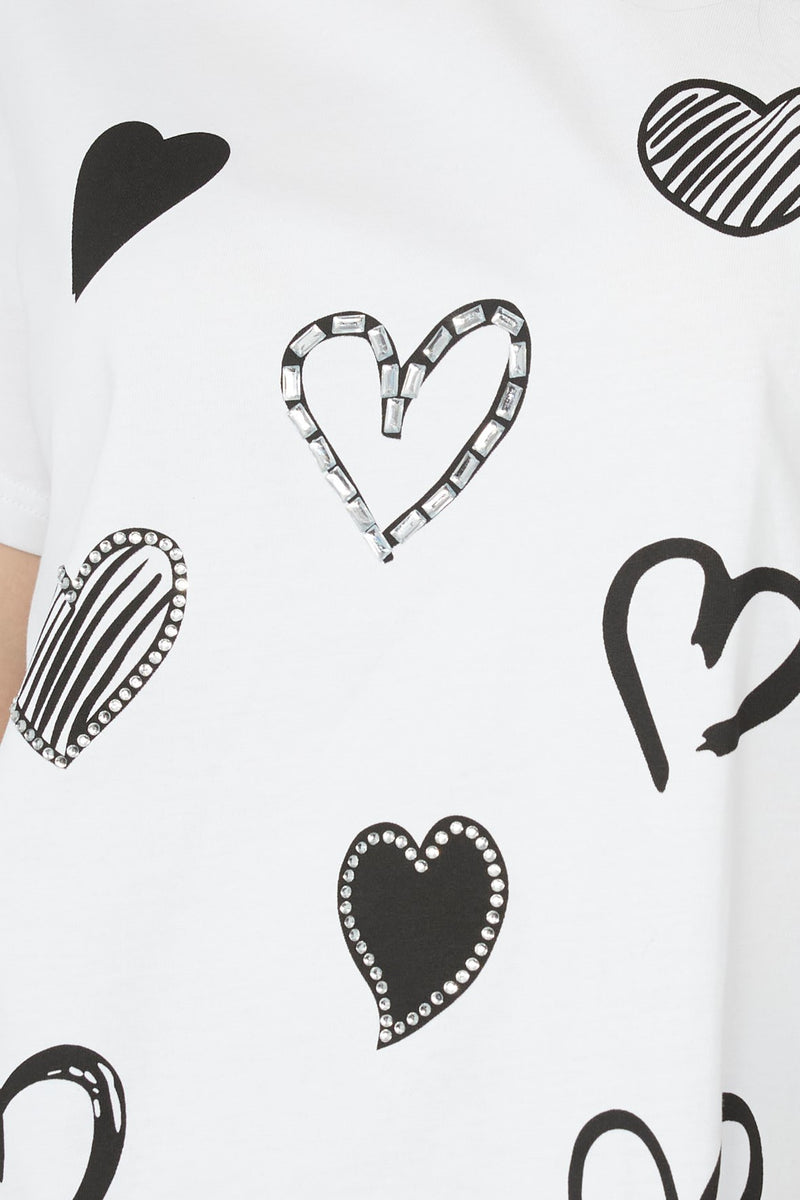 Introducing a must-have piece from Frank Lyman: this pullover-style top with a regular fit offers both comfort and style. Adorned with jewel embellishments and a charming heart print, it features a crew neck and short, straight sleeves. Perfect for casual summer outings, its hip-length design effortlessly combines a casual and feminine aesthetic, making it a versatile addition to your wardrobe.