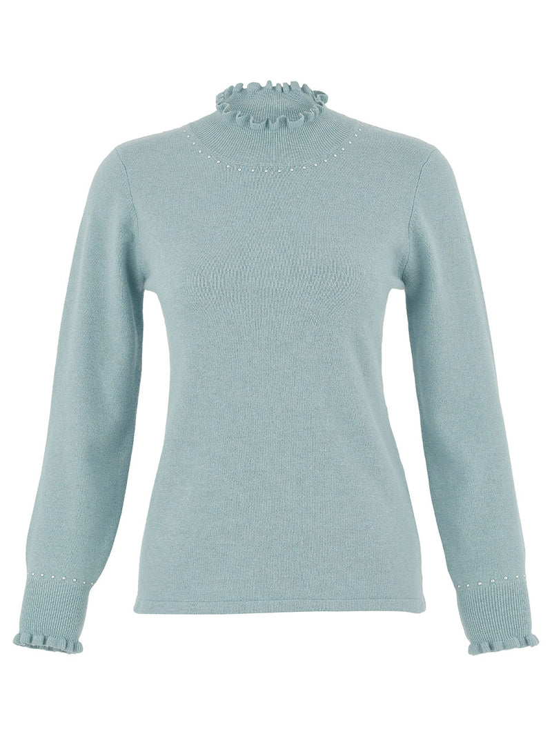 Introducing the Dolcezza Ruffle Polo Knit Jumper With Hot-Fix, a perfect blend of casual elegance and office-ready sophistication. This high-neck, hip-length top features jewel embellishments and ruffled accents for a touch of flair. Designed with a regular fit and straight long sleeves, it ensures comfort and style. Ideal for both casual and professional settings, this plain-patterned pullover is a versatile addition to your wardrobe.