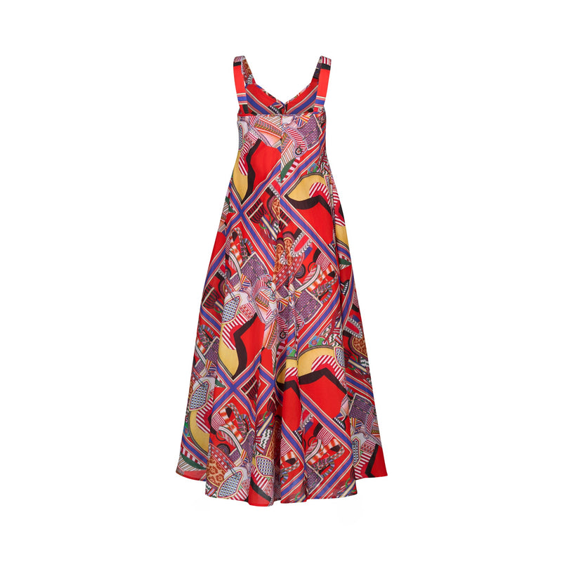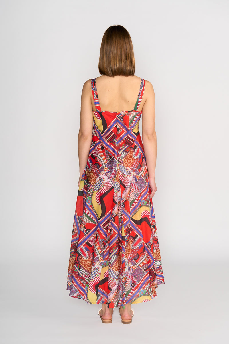 This full-length floaty summer Gala Dress features the bold Cleopatra print and is made from a lightweight cotton fabric with a soft cotton lining. The dress is shaped through the bust and waist and flows into a relaxed, breezy skirt, perfect for warm days and effortless style.