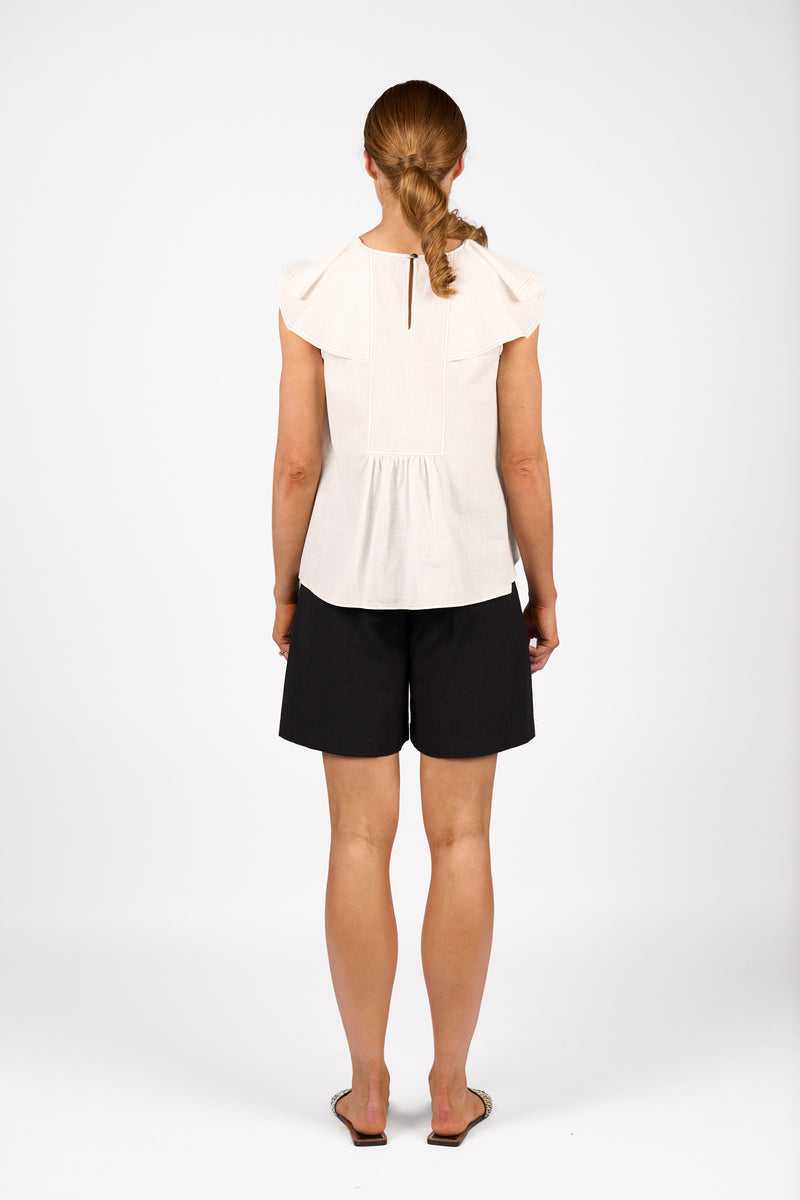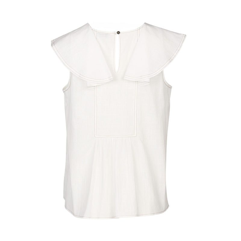 The Breeze Top in off-white is made from a lightweight cotton with a linen look. Its oversized bib collar curves over the shoulders and attaches to a softly gathered back panel, creating a relaxed and floaty silhouette perfect for warm days.